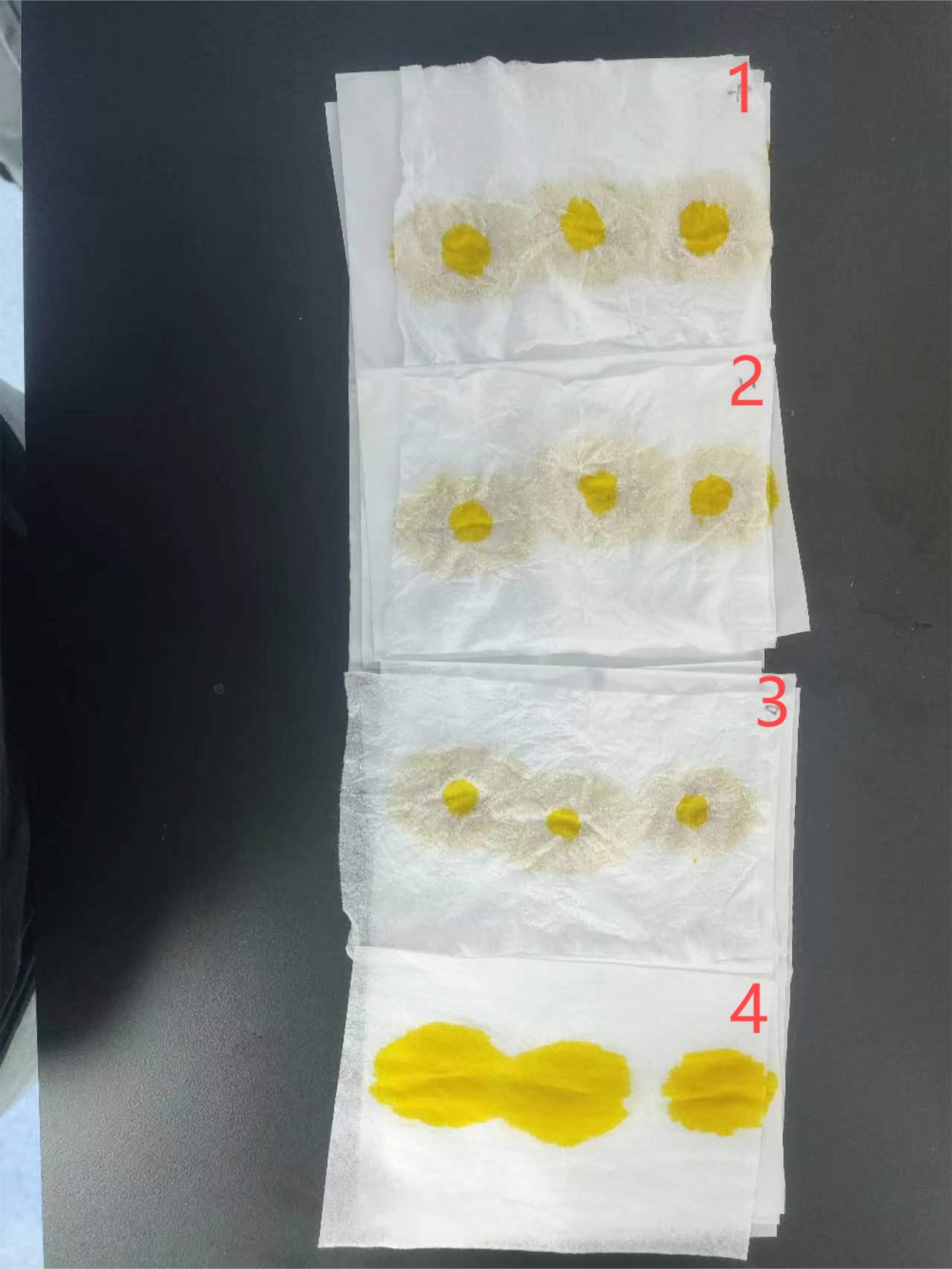 1、2、3是衛(wèi)生巾表層處理后樣品布,4是衛(wèi)生巾表層原布。從現(xiàn)場(chǎng)實(shí)驗(yàn)可看出,經(jīng)過(guò)拓瑞衛(wèi)生巾表層處理劑處理后的布,能實(shí)現(xiàn)定點(diǎn)滲透、強(qiáng)大防反滲性能,真正做到“正面一點(diǎn)點(diǎn),反面一大片”。讓液體遠(yuǎn)離皮膚,保持皮膚干燥,減少對(duì)皮膚的刺激。